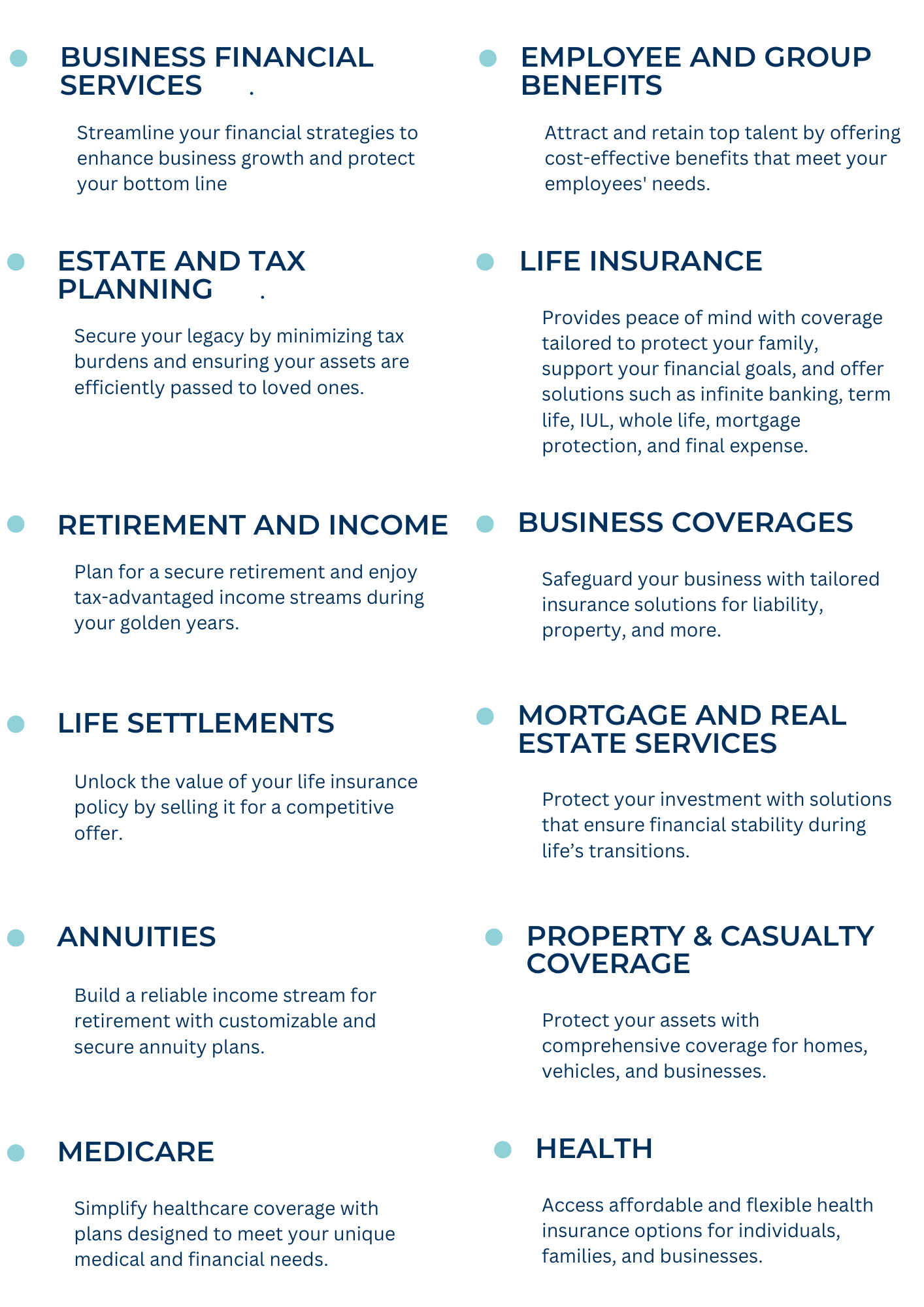 Our comprehensive business financial services are designed to support high-net-worth clients and businesses seeking strategic growth. We specialize in international investment opportunities, crafting long-term financial plans, and managing business succession. Our expertise also covers buy-sell agreements and executive benefits, ensuring your business remains secure and prosperous. You can depend on Wealth Manifested Enterprises to provide custom solutions that align with your financial goals and facilitate successful transitions.